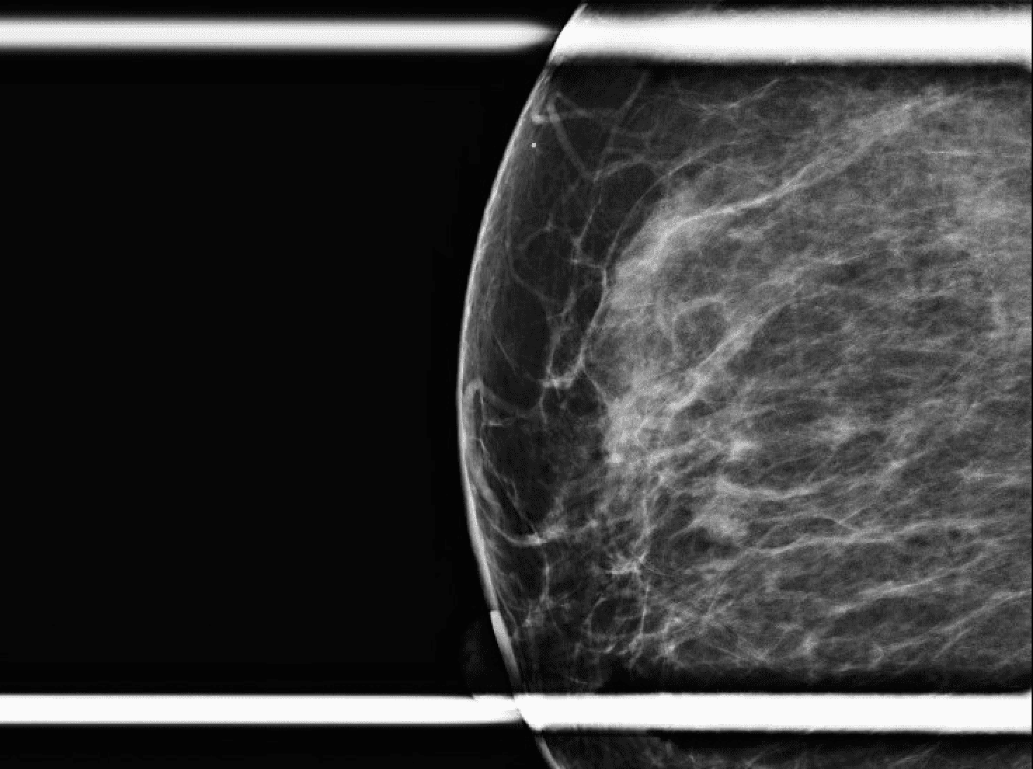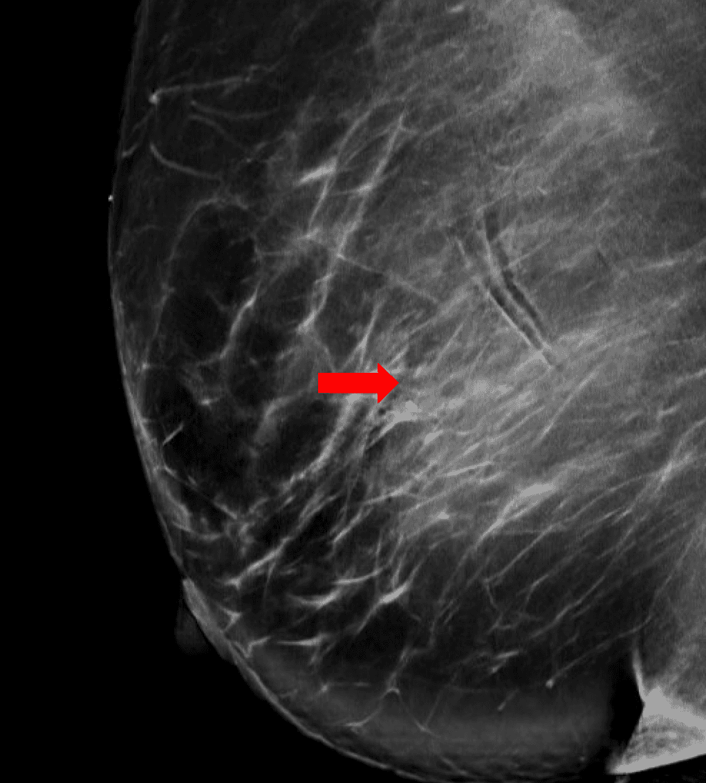 Figure 1. Initial screening mammogram (R mediolateral orientation, followed by craniocaudal). Revealed the concerning area of question measured to be approximately 0.6 x 0.8 x 0.7 cm in size, located at 11 oc and 1 cm FTN.
