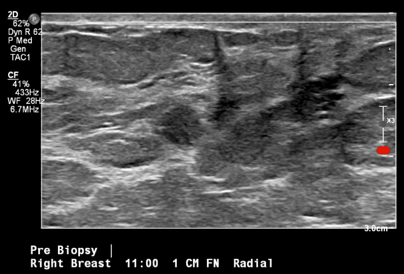 Patient is a 46-year-old premenopausal female with no other contributing past medical or surgical history who presented initially to the breast surgery clinic after her annual screening mammogram discovered a nonpalpable right breast mass measuring 0.6 x 0.8 x 0.7 cm at 11 o’clock (oc), 1 cm from the nipple (FTN) (Figure 1). She had three previous screening mammograms without any notable findings. The screening mammogram was declared inconclusive (BI-RADS 0), and a breast ultrasound was completed with similar findings. Further discussion with the patient revealed that there had been some bloody discharge seen in the right side of her bra over the last few months, but no other concerns or symptoms. Given the inconclusive imaging findings, it was decided to perform a diagnostic mammogram for a more specific assessment (Figures 2a and 2b) following an ultrasound-guided core-needle biopsy and localizing clip placement for a tissue diagnosis (Figure 3). Pathology revealed an intraductal papilloma with ductal hyperplasia and apocrine metaplasia without atypia. Given her continued bloody nipple discharge, there was concern for possible underlying premalignant cells (discussed more later); thus, it was recommended that the patient undergo partial mastectomy. The mass remained nonpalpable; therefore, a Savi Scout would be placed just before operative intervention to help localize the area of concern.