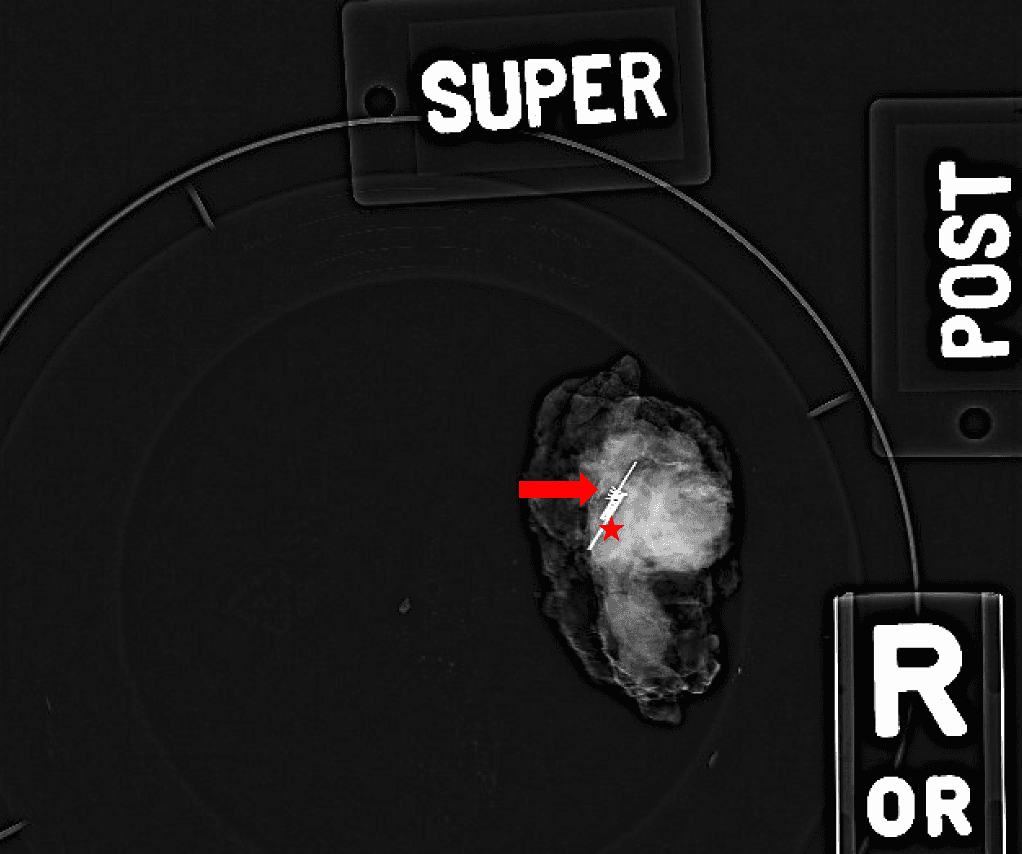 Figure 4. The intraoperative X-ray of the excised mass. Used to confirm the biopsied area with the coiled clip (arrow), and the previously placed Savi Scout, shaped like a barbell (star) is removed. When necessary, post-excision X-rays will also reveal if there is any remaining concerning tissue present at the margins of the excised mass.